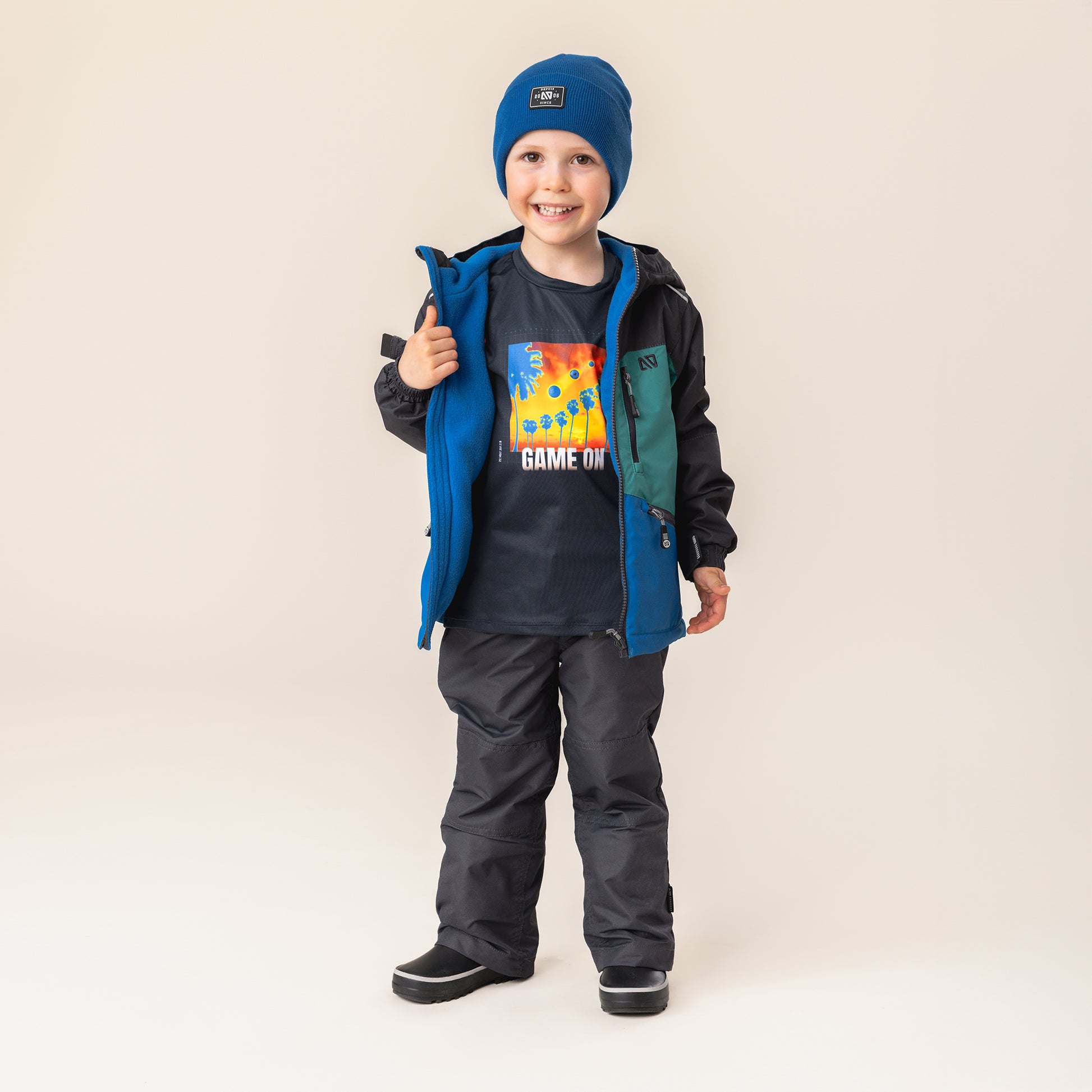 • Adjustable pant length with snap button in sizes 2 to 10 years